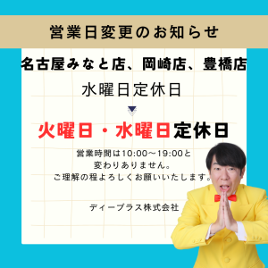 12月より名古屋みなと店、岡崎店、豊橋店の営業日が変更となります。