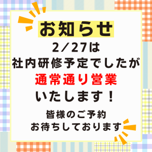 2月27日(木)が社内研修のためお休みをいただく予定でしたが、